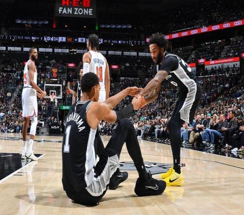 进入第四节比赛,福克斯抢断暴扣与卡斯尔两罚一中,文班亚马左腿受伤被换下场返回更衣室。克拉克森引领一波8-3攻势扩大11分优势,尚帕尼连中两记三分打停尼克斯,布伦森抛射命中。福克斯再得5分,阿奴诺比两罚一中与克拉克森三分命中,尚帕尼连中两记三分与福克斯抛射命中反超2分打停尼克斯。唐斯抛射得分,福克斯再得4分,麦克布莱德三分命中追到差1分,科内特补篮得分,麦克布莱德中投命中。双方接连打铁,科内特勾手命中加罚不中,唐斯6犯毕业,凯尔登抢篮板被犯规两罚全中扩大5分优势。布伦森三分命中续命,巴恩斯被犯规两罚全中,布伦森三分不中,凯尔登被犯规两罚全中扩大6分优势。麦克布莱德三罚全中追分,凯尔登抢到关键球权被犯规继续罚球扩大优势锁定胜局,最终马刺逆转险胜尼克斯。